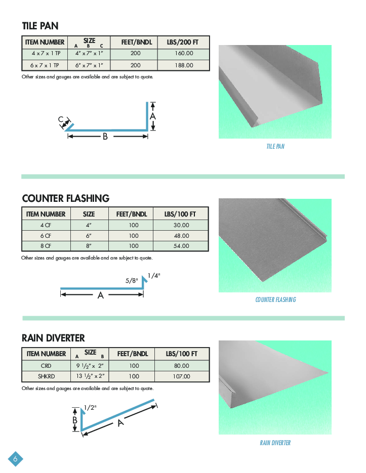 FLASHINGS Nosing Gravel Stop Wall to Roof Z-Bar W-Valley Termite Flashing Tile Pan Counter Flashing Rain Diverter |
