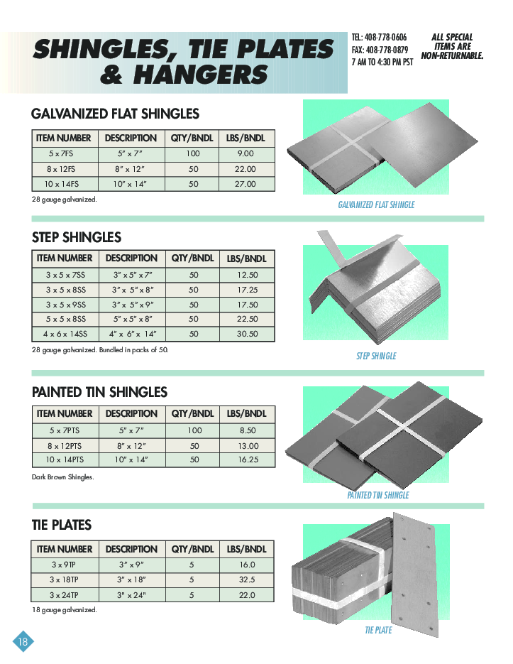SHINGLES, TIE PLATES, HANGERS Galvanized Flat Shingles Step Shingles Painted Tin Shingles Tie Plates Flu Hangers Flu Brackets |